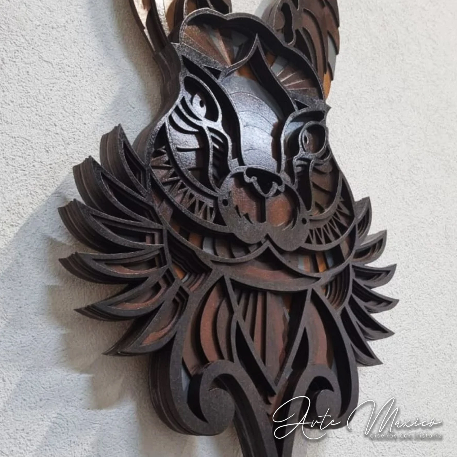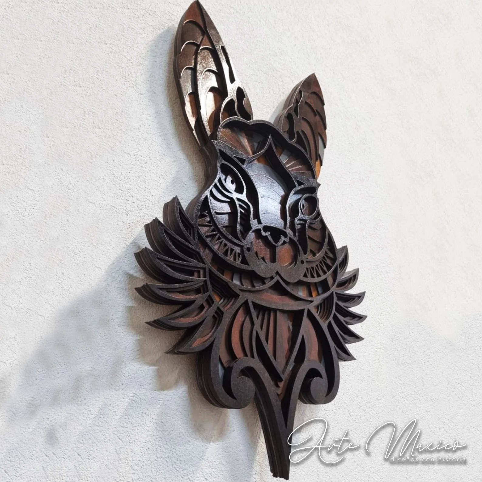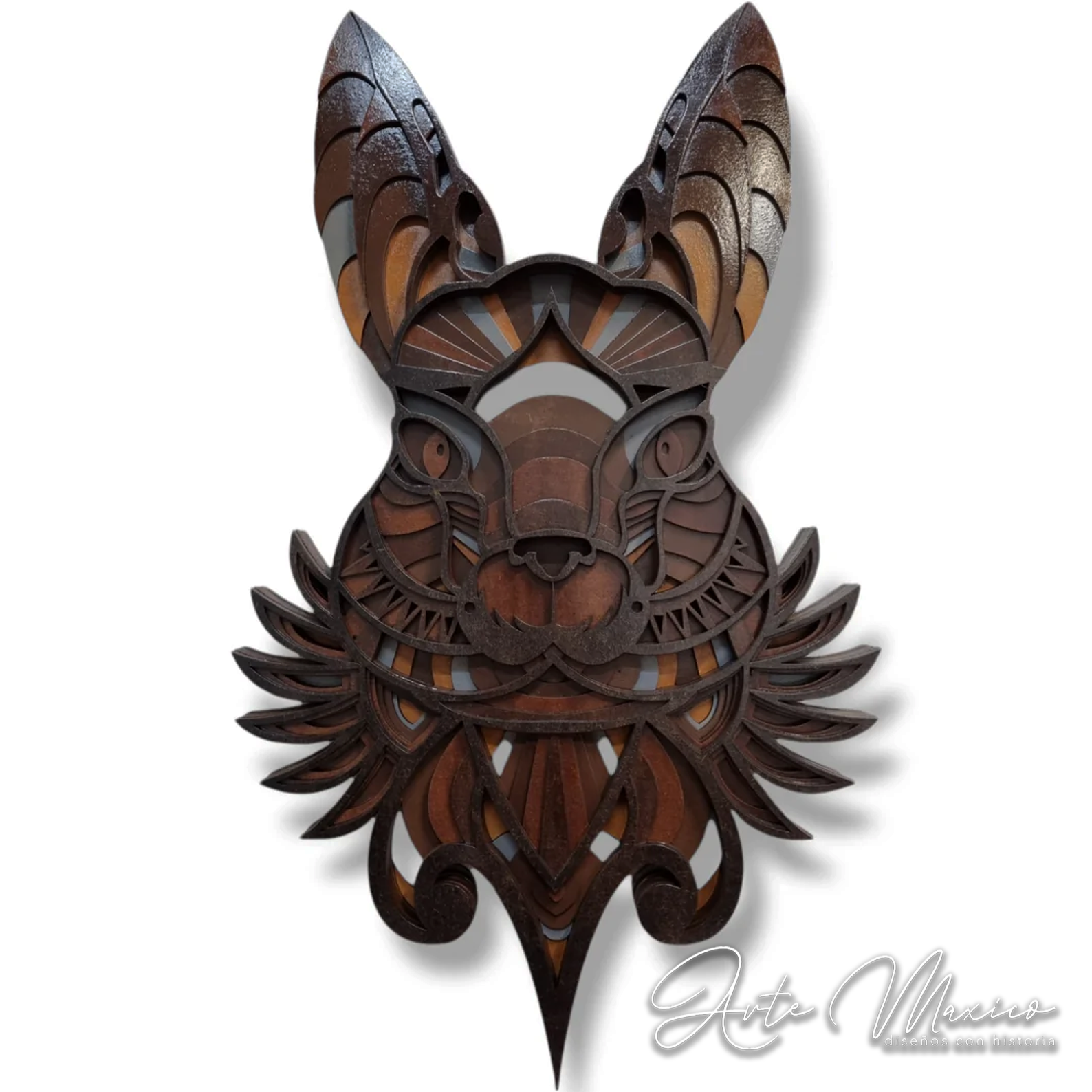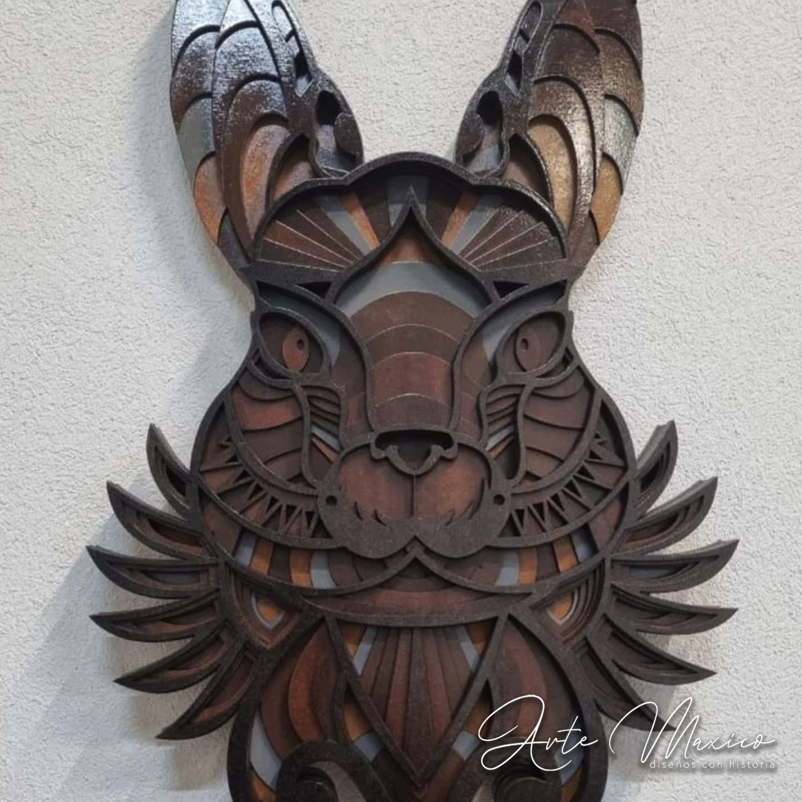 Impresionante diseño de este conejo elaborado en varias capas de maderas cada una pintada en un tono distinto para generar ese efecto de profundidad 3D.