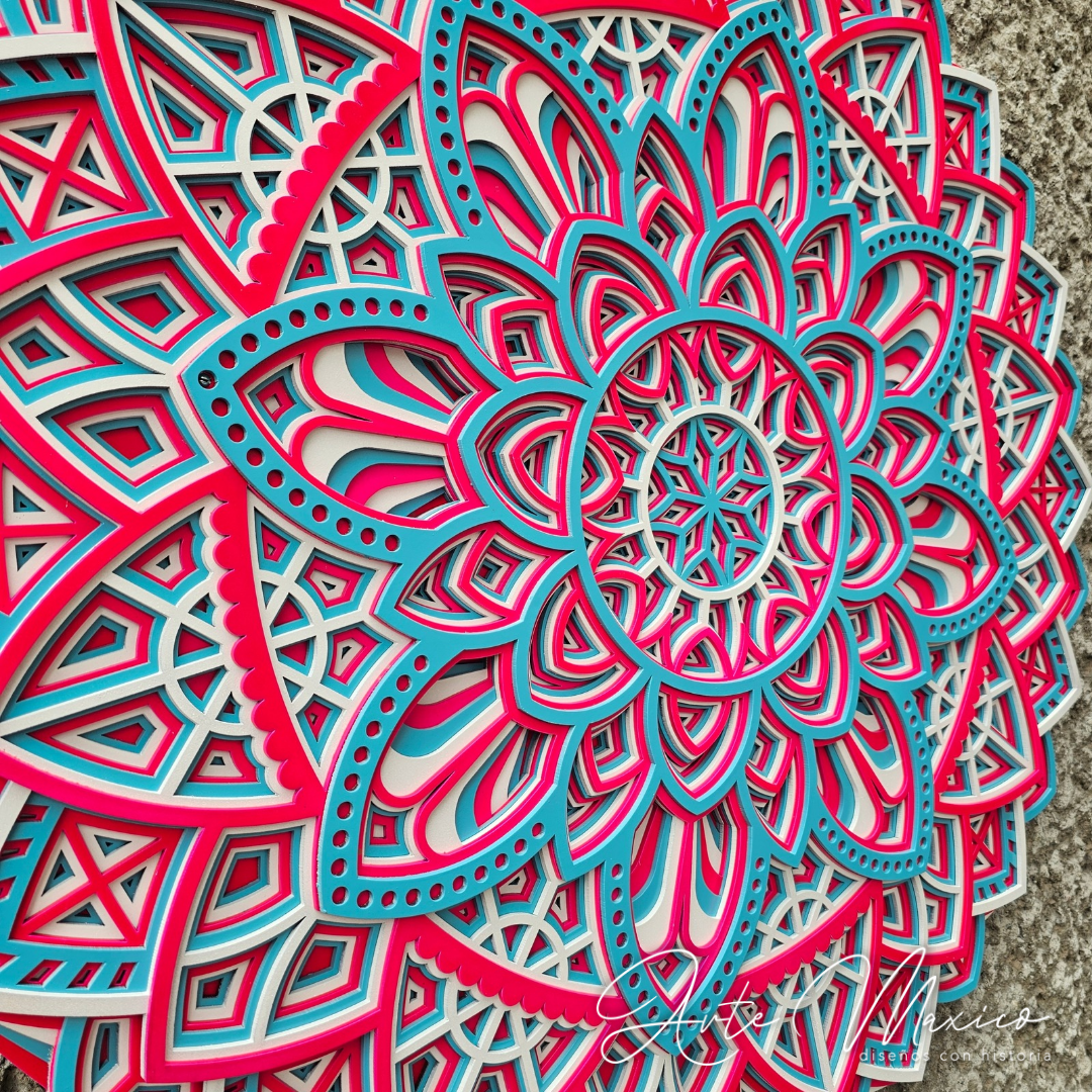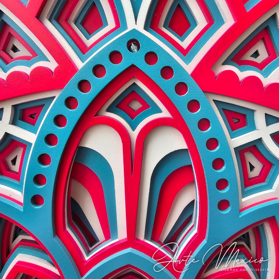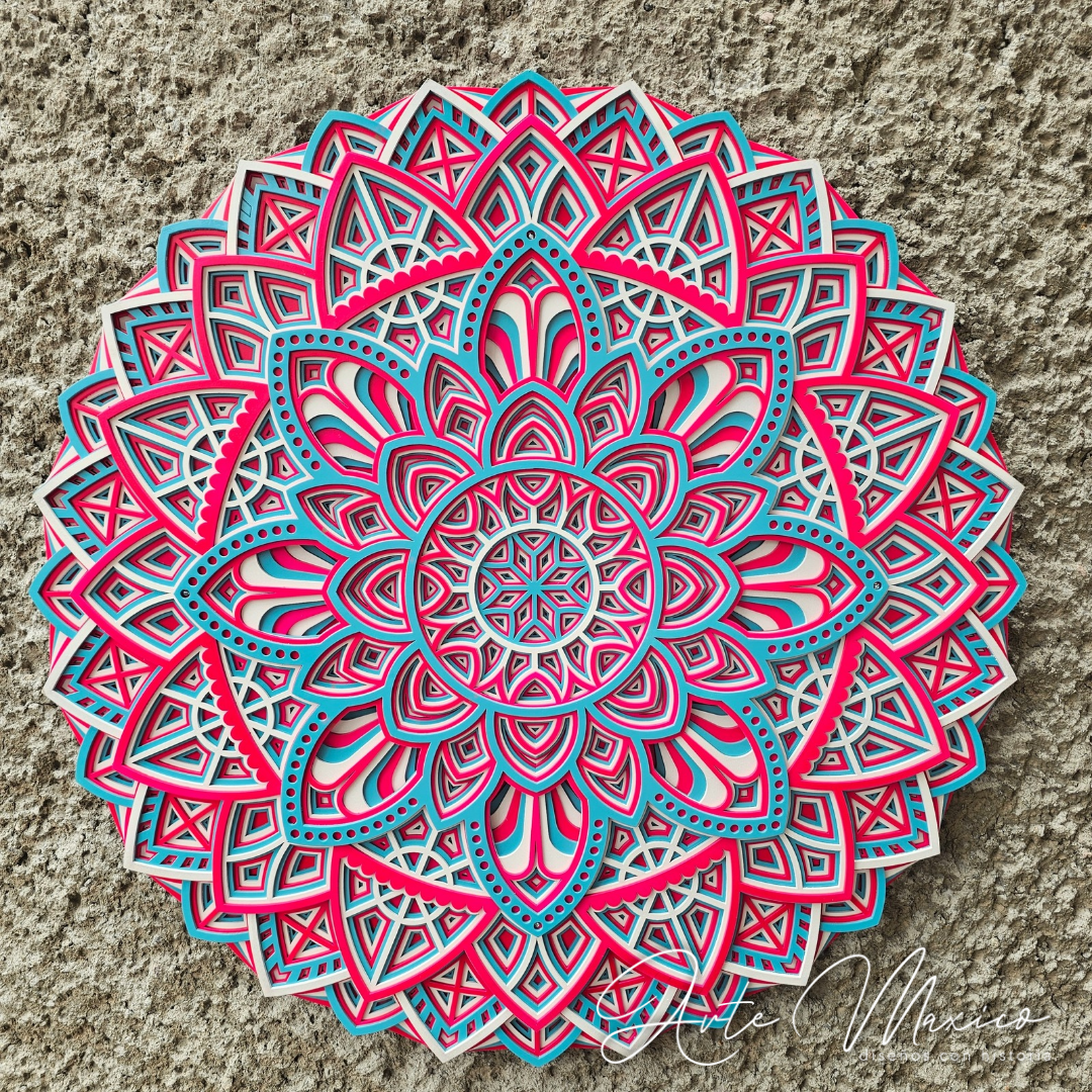 Disponible en 60cm y 80cm diámetro, son 8 capas de 3mm cada una, al final queda una pieza de 24mm totales. Canda capa va pintada a mano según la combinación de colores que elijas, lo cual en conjunto, crea un efecto de profundidad y enmarca cada color, creando mayor impacto visual una vez puestas todas las capas.
