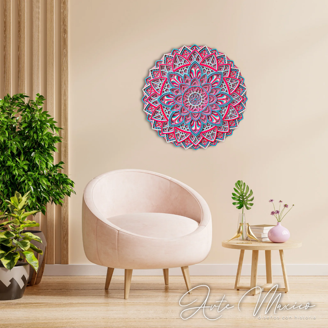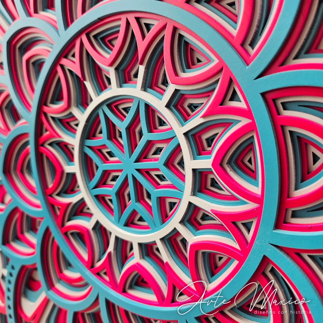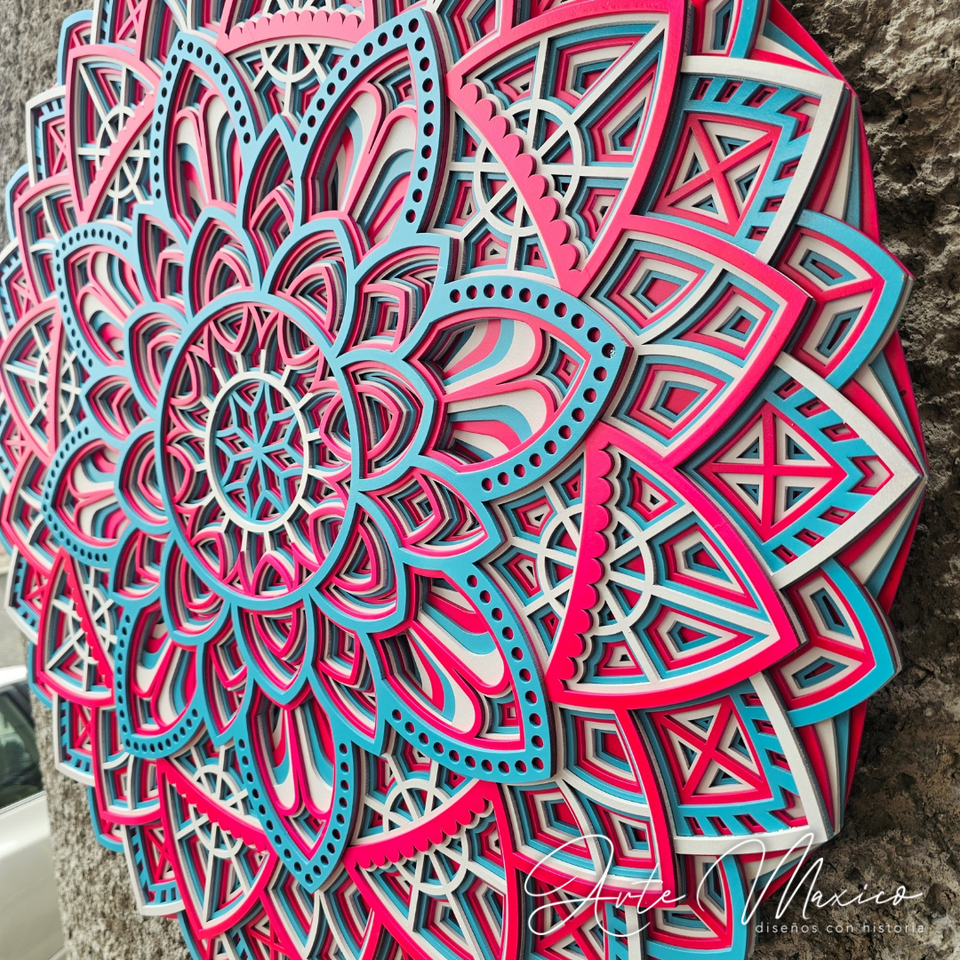 Disponible en 60cm y 80cm diámetro, son 8 capas de 3mm cada una, al final queda una pieza de 24mm totales. Canda capa va pintada a mano según la combinación de colores que elijas, lo cual en conjunto, crea un efecto de profundidad y enmarca cada color, creando mayor impacto visual una vez puestas todas las capas.