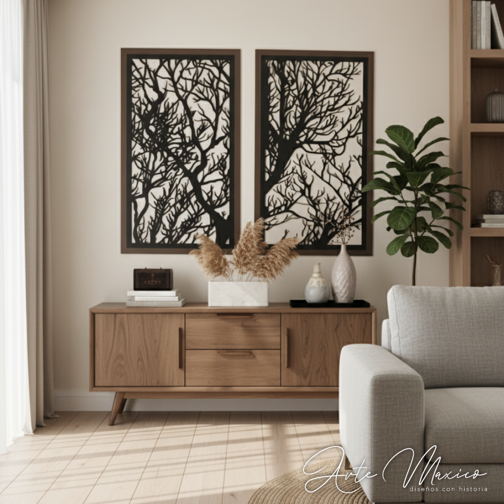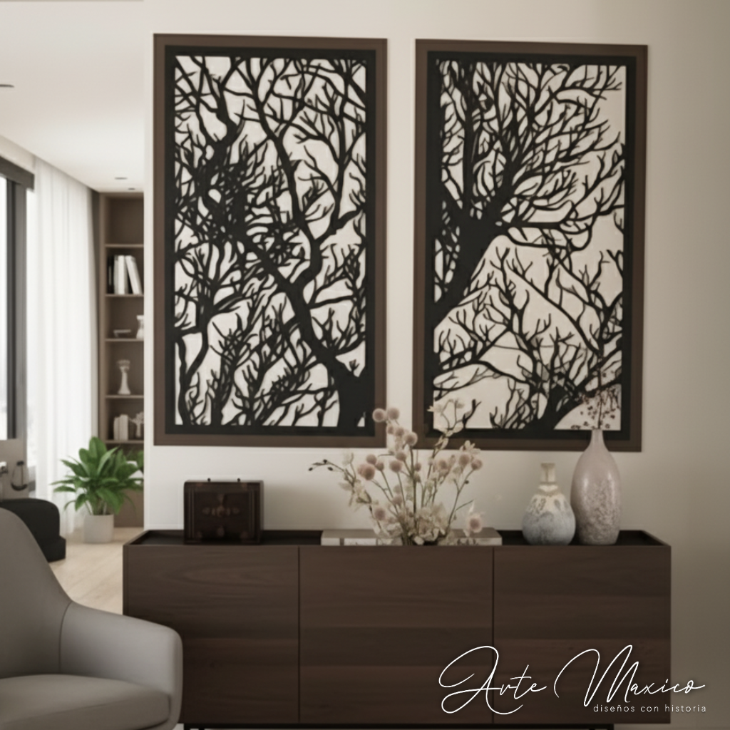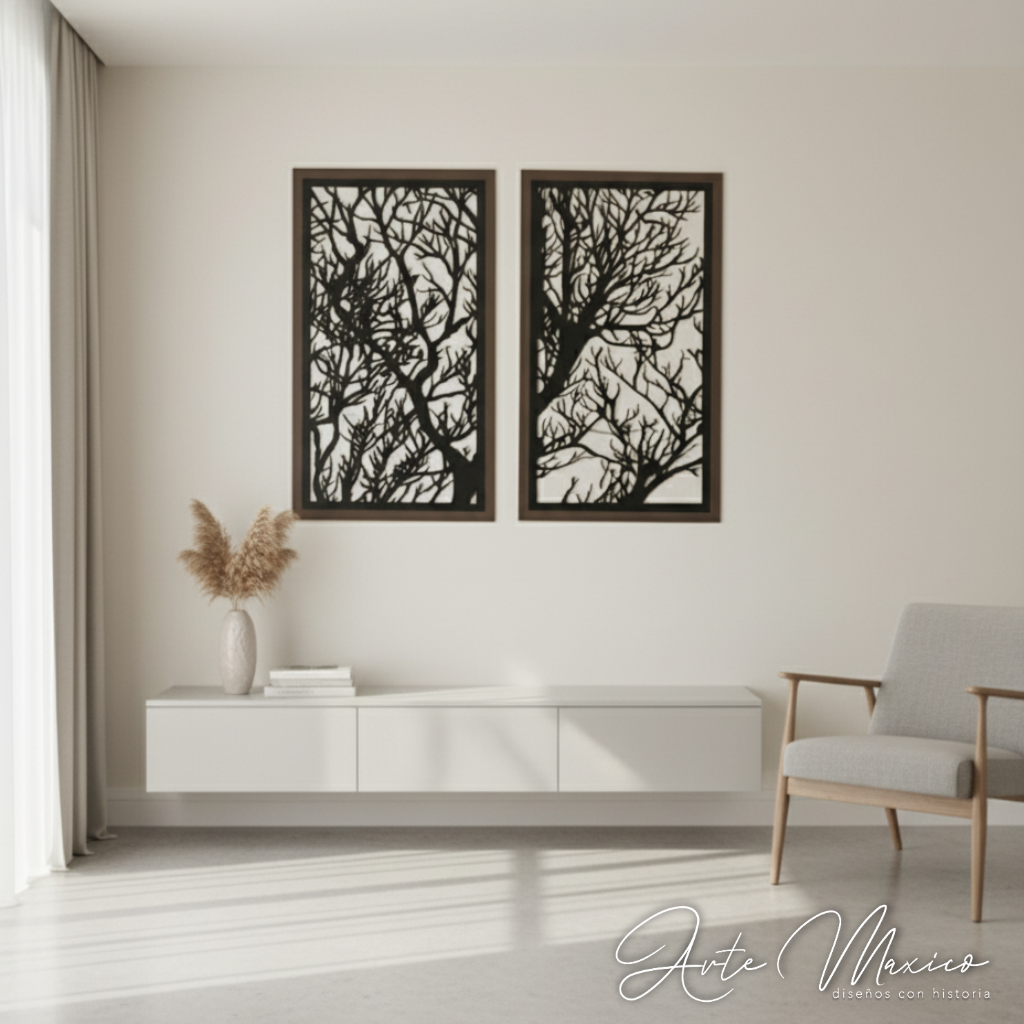 Lindo par de ramas enmarcadas color negro con marcos color chocolate. Están elaborados en madera MDF de Importación con corte laser, miden 90x50cm cada uno.
